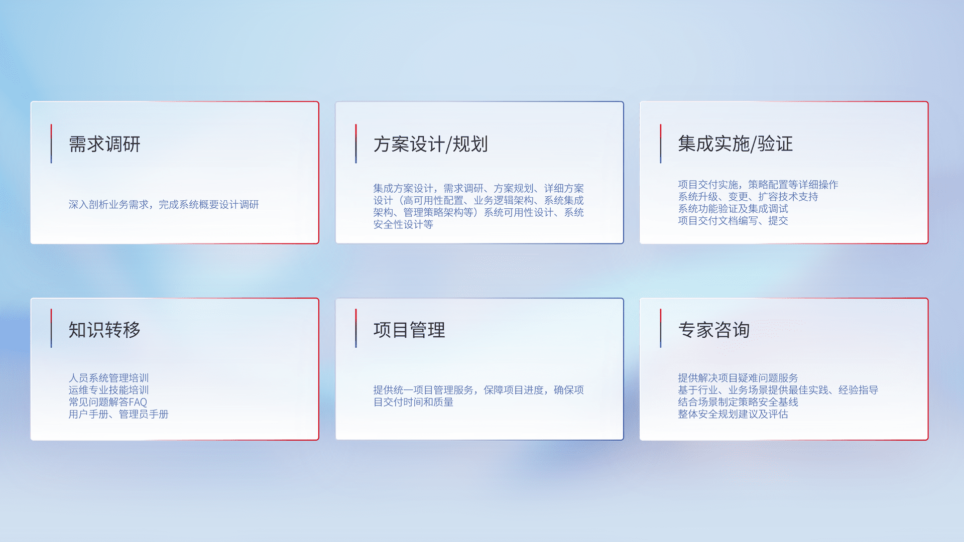 针对客户行业特性,,,,将宏观的安全战略和需求,,,,通过专业的交付服务,,,实现项目落地,,,,为客户提供标准规范的集成交付服务。。。。